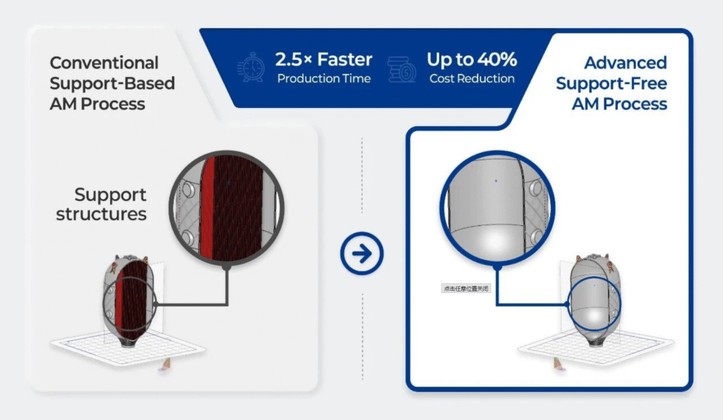 In traditional metal additive manufacturing, internal support structures are usually required to prevent deformation during the printing process. However, these supports increase post-processing workload, extend production cycles, and limit design freedom, thereby raising both time and cost. The removal of supports is often a labor-intensive and frustrating step, as many practitioners in the field have also noted.