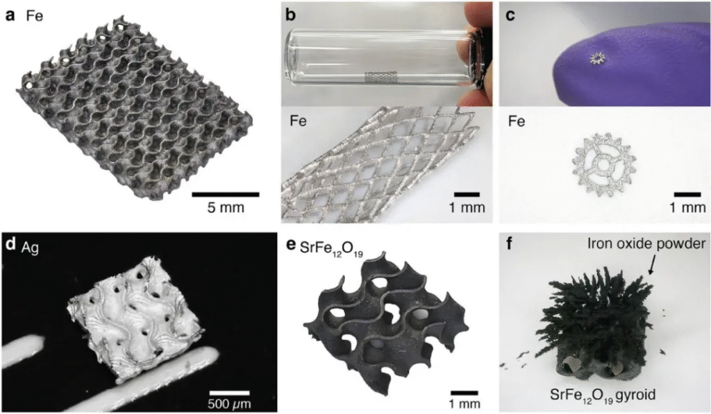 In this study, the research team fabricated intricate mathematical lattice structures, known as gyroids, using iron, silver, and copper to demonstrate the ability of their technique to produce strong yet complex geometries. To evaluate the material’s performance, they applied increasing pressure to the gyroid samples using a universal testing machine.