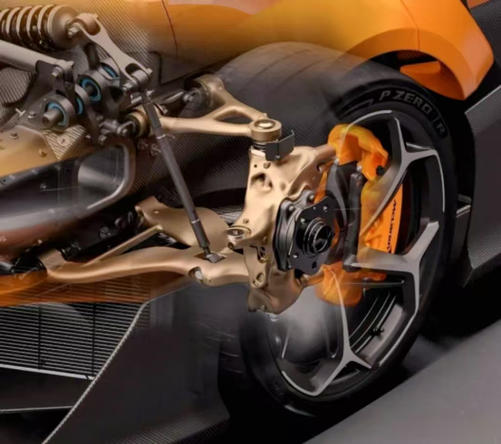 Leveraging Divergent’s state-of-the-art additive manufacturing technologies, McLaren has created a highly efficient and structurally complex suspension system designed for maximum durability and rigidity. Key components include the upper front wishbone, aerodynamically optimized lower wishbone, and front bracket—all integral to the hypercar’s performance.