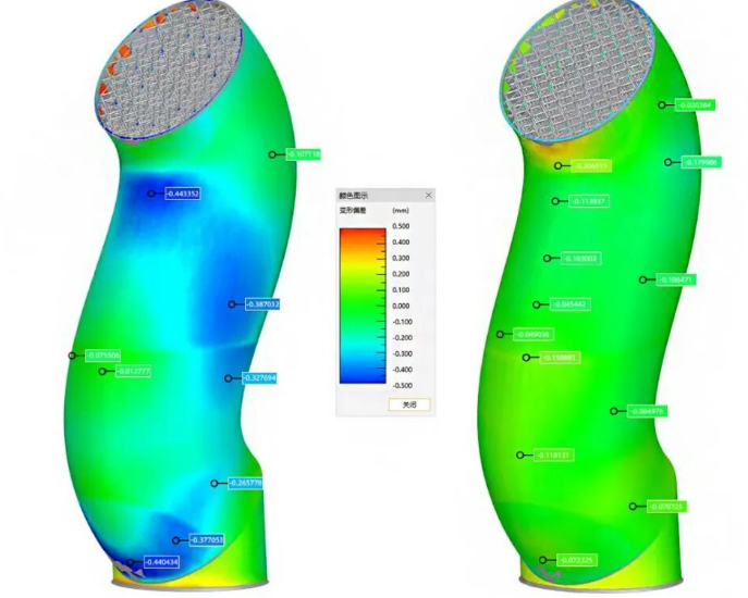 Finally, the design team used the compensated model for a second print and conducted another 3D scan of the finished part. The comparison results showed that the previously severe deformation was effectively controlled, with overall dimensional deviation reduced to within 0.2 mm, achieving more than double the precision improvement.