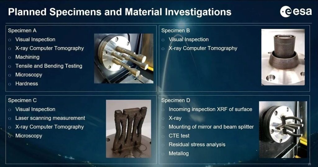 Samples produced on the International Space Station were returned to Earth around February 2025, but the subsequent testing has taken much longer than initially expected. The in-space printing campaign lasted several months and resulted in multiple samples, including three tensile test specimens and three bending strength test specimens, thin-walled structures, a compliant mechanism (which failed), as well as a mirror mount sample developed by the Technical University of Denmark.