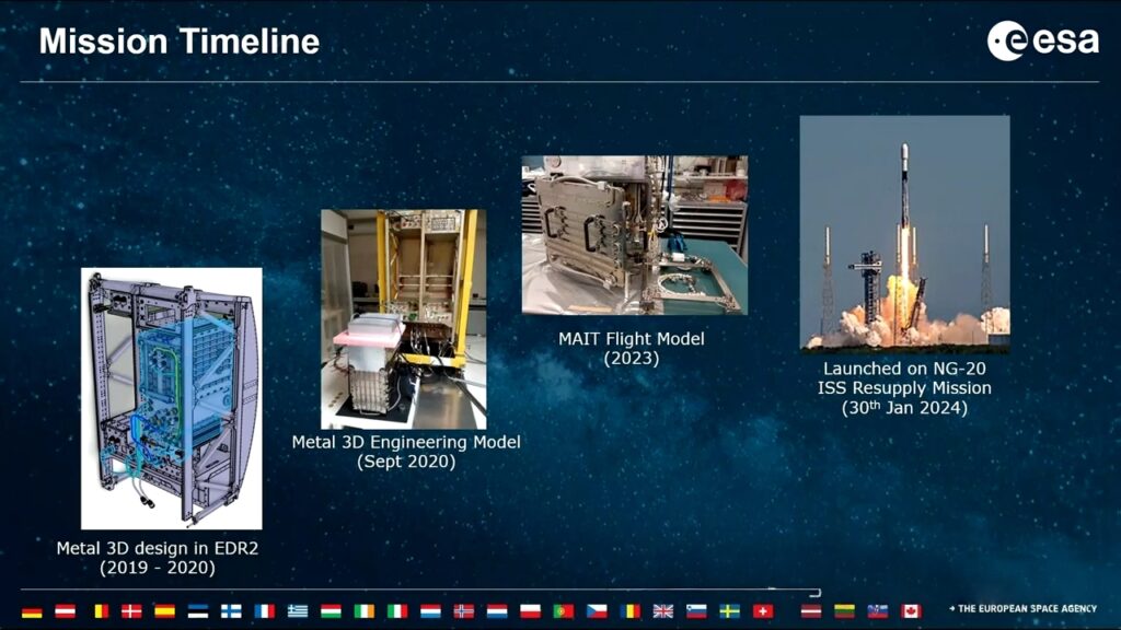 The project was initiated in 2017. The design of the printer itself took place from 2019 to 2020, followed by a series of tests and refinements, and it was finally sent to the International Space Station in early 2024.