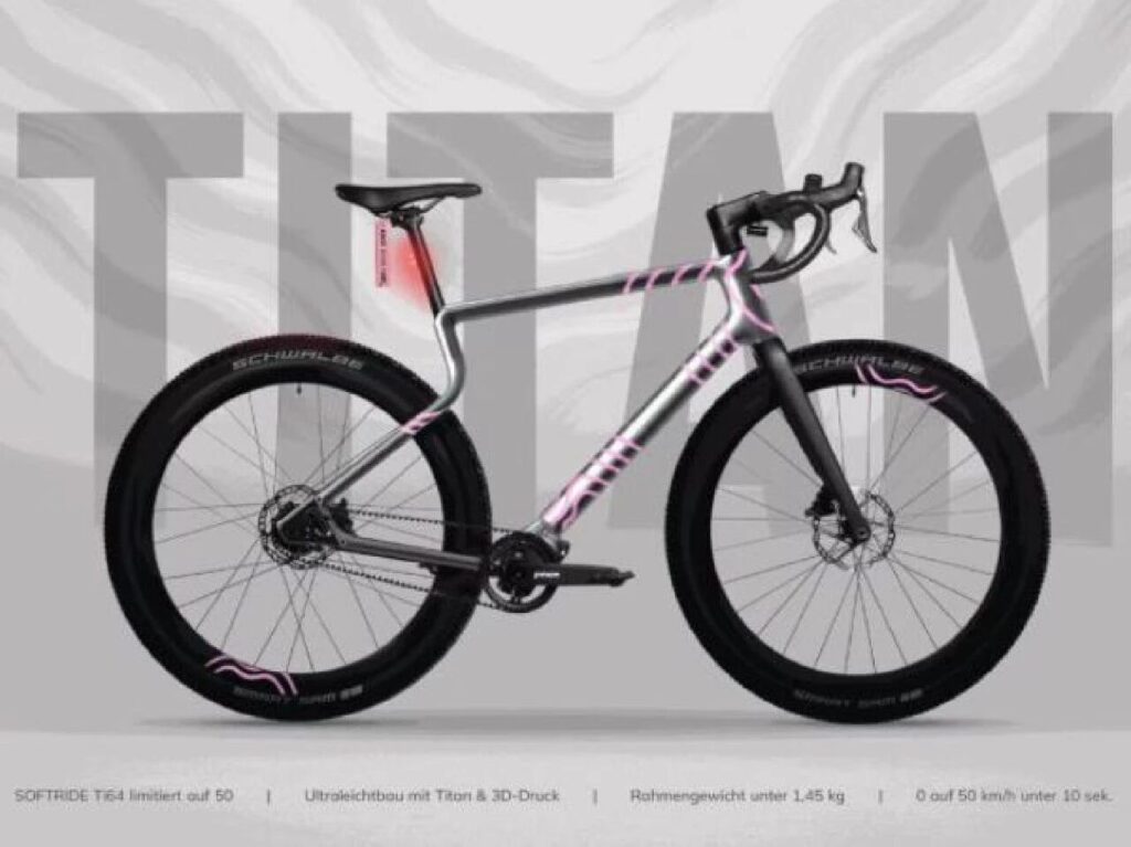 The new frame retains the familiar geometry of the URWAHN Softride design. According to the company, only the material has changed, not the form. The 3D-printed titanium structure is intended to balance lightweight construction, durability, and riding dynamics, while offering better corrosion resistance and fatigue performance than carbon fiber.