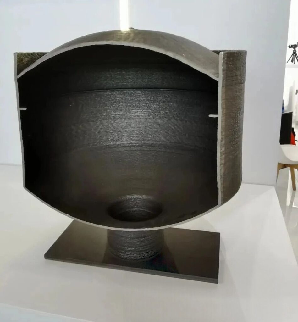 Rongsu Technology, a leading provider of metal wire feed additive manufacturing solutions in China, has achieved unsupported metal 3D printing through multi-axis motion. The company showcased scaled-down models of 316L stainless steel fuel tanks and large aerospace liquid oxygen tanks made with arc 3D printing at the exhibition. These demonstrations highlight that the manufacturing of fuel tanks is not limited to laser powder bed fusion processes alone.